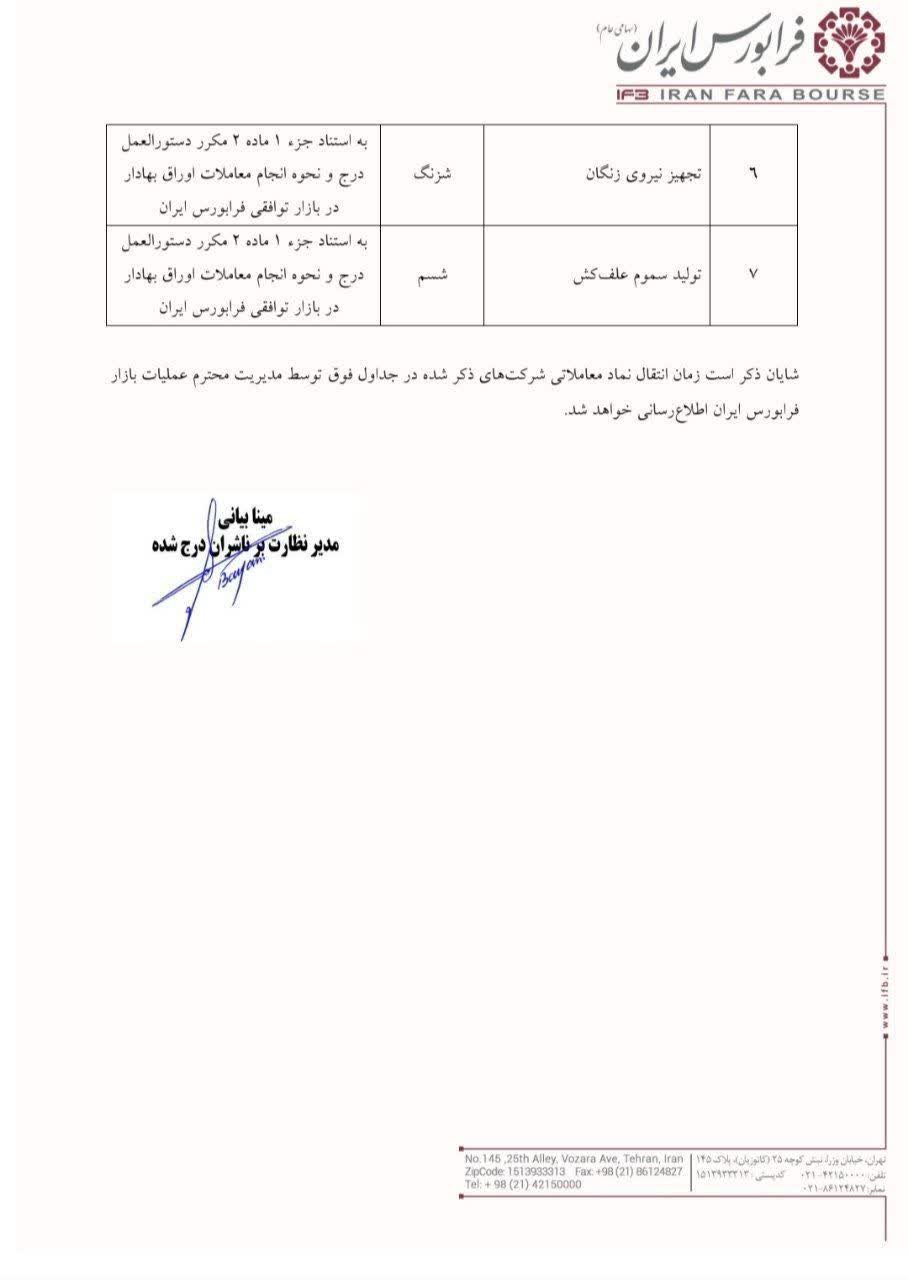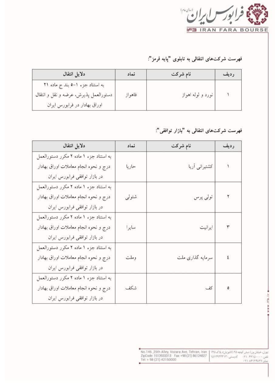 شایان ذکر است زمان انتقال نماد معاملاتی شرکت های ذکر شده در جداول فوق توسط مدیریت محترم عملیات بازار فرابورس ایران اطلاع رسانی خواهد شد.