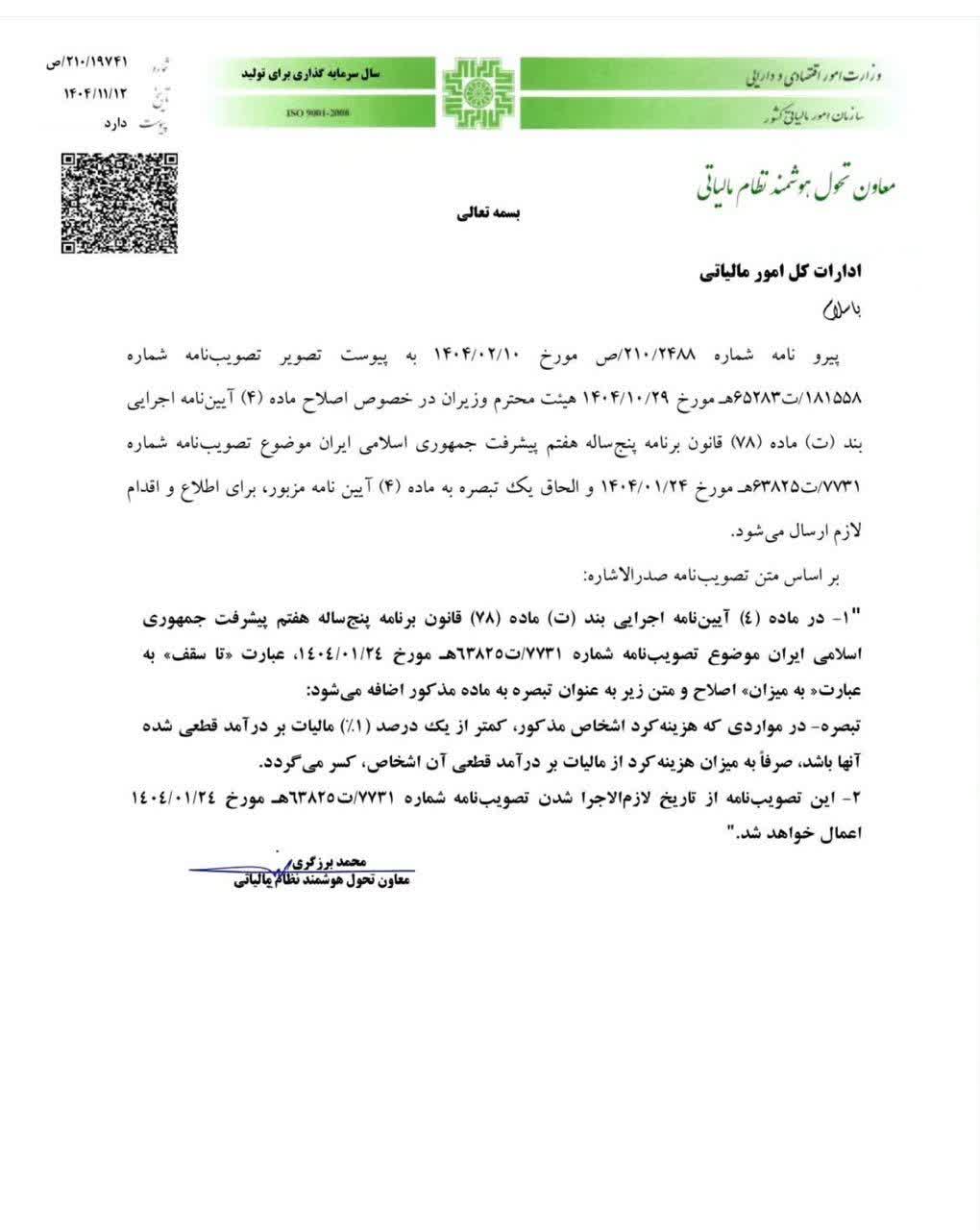 موضوع نامه شماره 210/19741/ص تاریخ 1404/11/12 معاون تحول هوشمند نظام مالیاتی