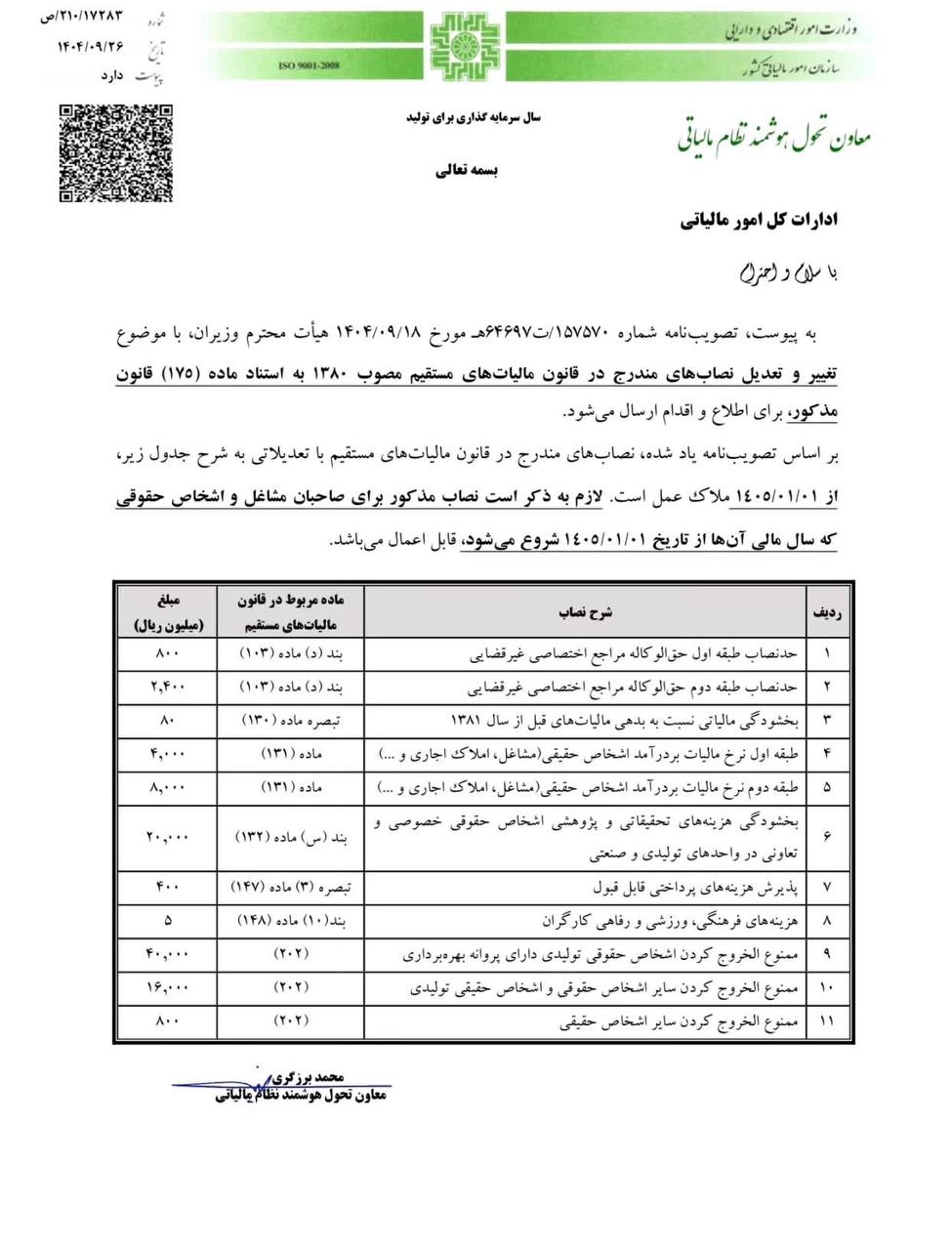 بخشنامه تغییرات حد نصاب از ابتدای سال ۱۴۰۵