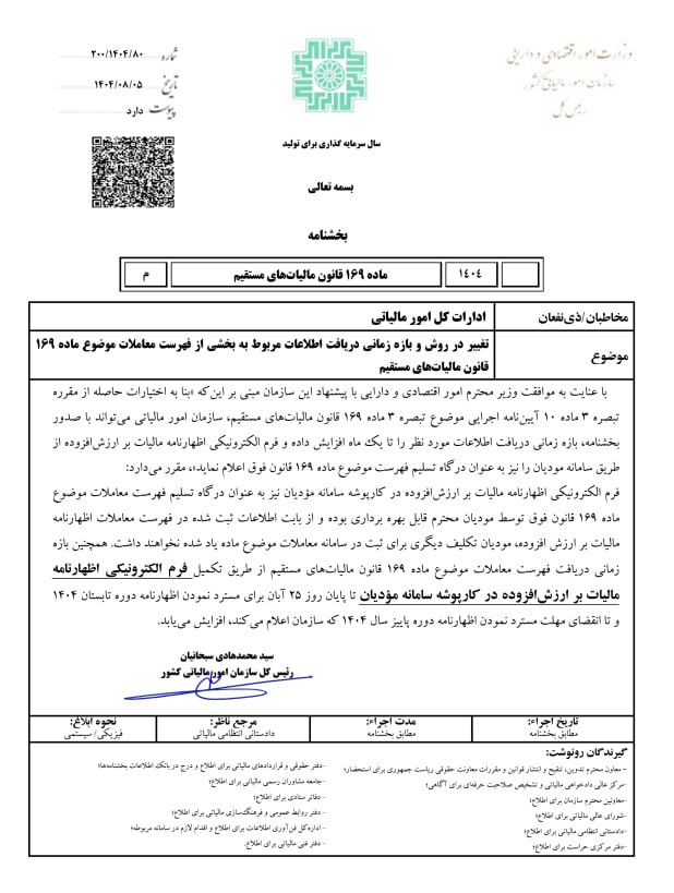 بخشنامه تغییر در روش و بازه زمانی دریافت اطلاعات مربوط به بخشی از فهرست معاملات موضوع ماده ۱۶۹ قانون مالیات های مستقیم