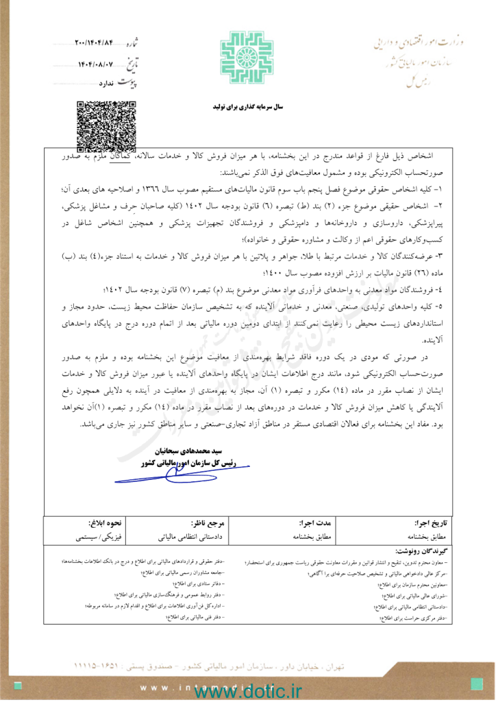بخشنامه شماره ۲۰۰/۱۴۰۴/۸۴ مورخ ۱۴۰۴/۰۸/۰۷ رئیس کل سازمان امور مالیاتی کشور
