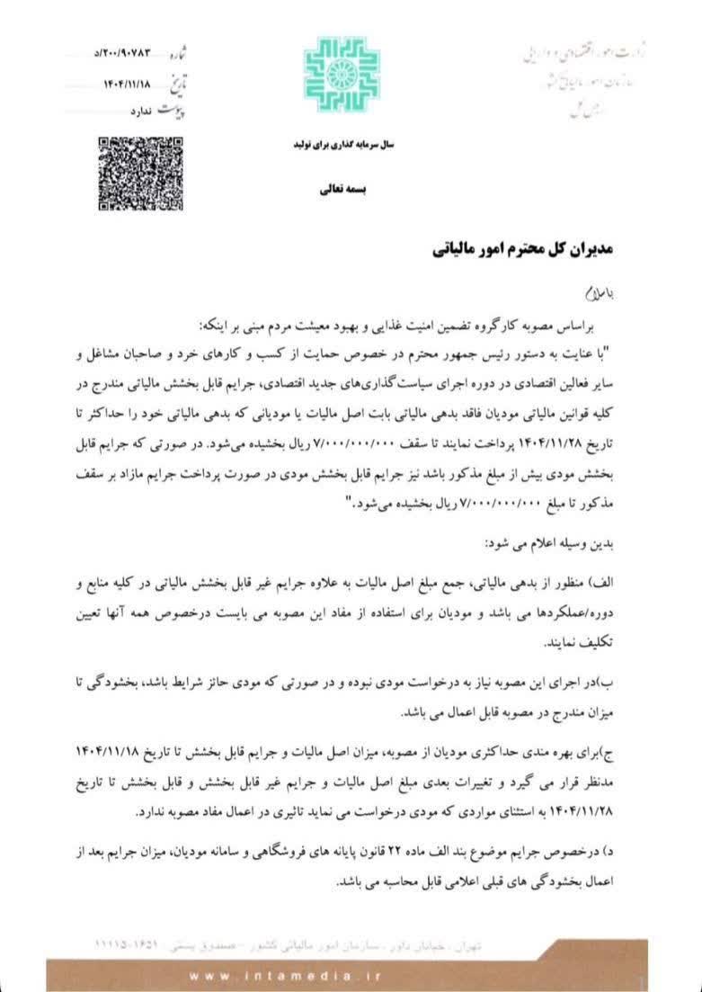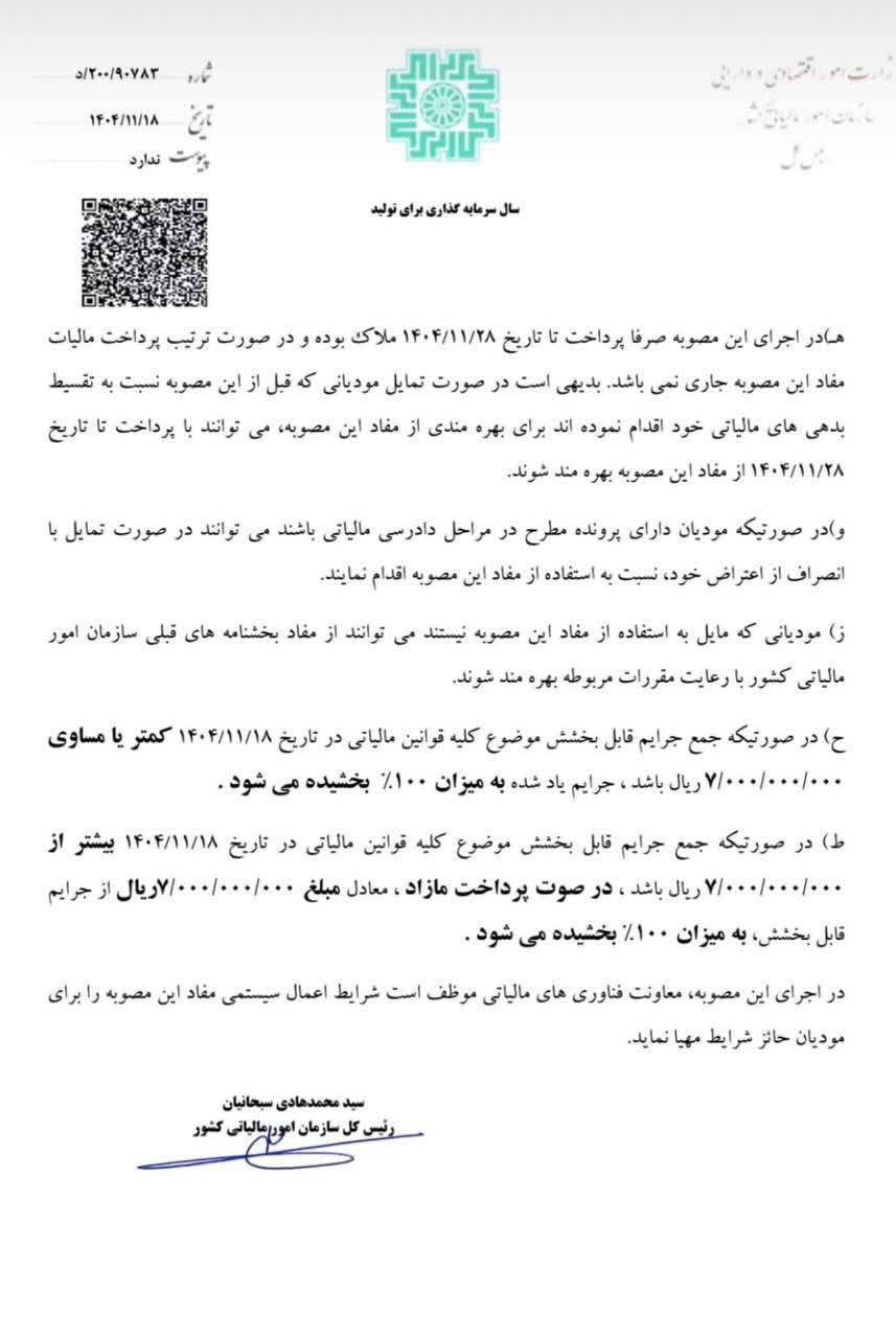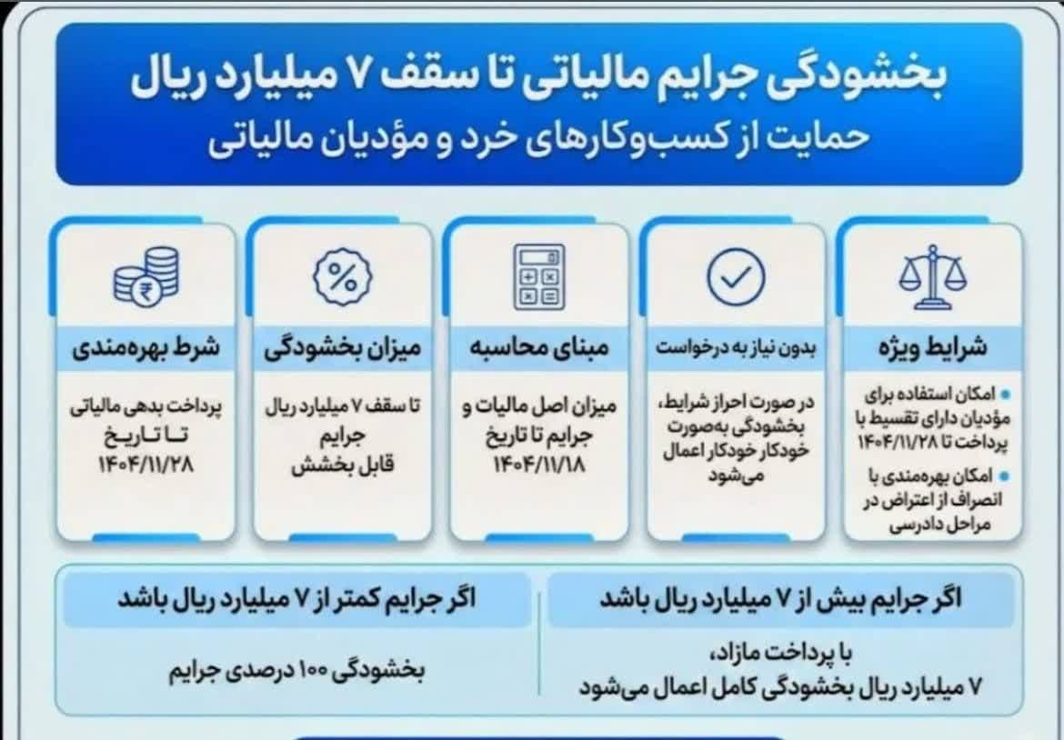 ” با عنایت به دستور رئیس جمهور محترم در خصوص حمایت از کسب و کارهای خرد و صاحبان مشاغل و سایر فعالین اقتصادی در دوره اجرای سیاست گذاری های جدید اقتصادی، جرایم قابل بخشش مالیاتی مندرج در کلیه قوانین مالیاتی مودیان فاقد بدهی مالیاتی بابت اصل مالیات یا مودیانی که بدهی مالیاتی خود را حداکثر تا تاریخ 1404/11/28 پرداخت نمایند تا سقف 7/000/000/000 ريال بخشیده می شود.