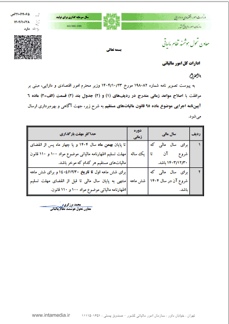 به پیوست تصویر نامه شماره 198082 مورخ 1404/10/23 وزیر محترم امور اقتصادی و دارایی، مبنی بر موافقت با اصلاح مواعد زمانی مندرج در ردیف های (1) و (2) جدول بند (2) قسمت (الف – 2) ماده 6 آیین نامه اجرایی موضوع ماده 95 قانون مالیات های مستقیم به شرح زیر، جهت آگاهی و بهره برداری ارسال می شود .