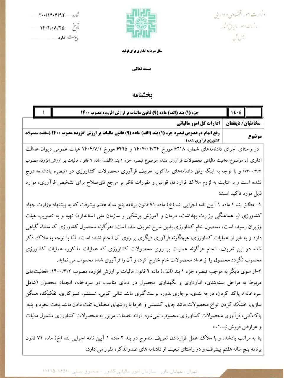 رفع ابهام در خصوص تبصره جزء (1) بند (الف) ماده (9) قانون مالیات بر ارزش افزوده مصوب 1400 (معافیت محصولات کشاورزی فرآوری نشده ) |
