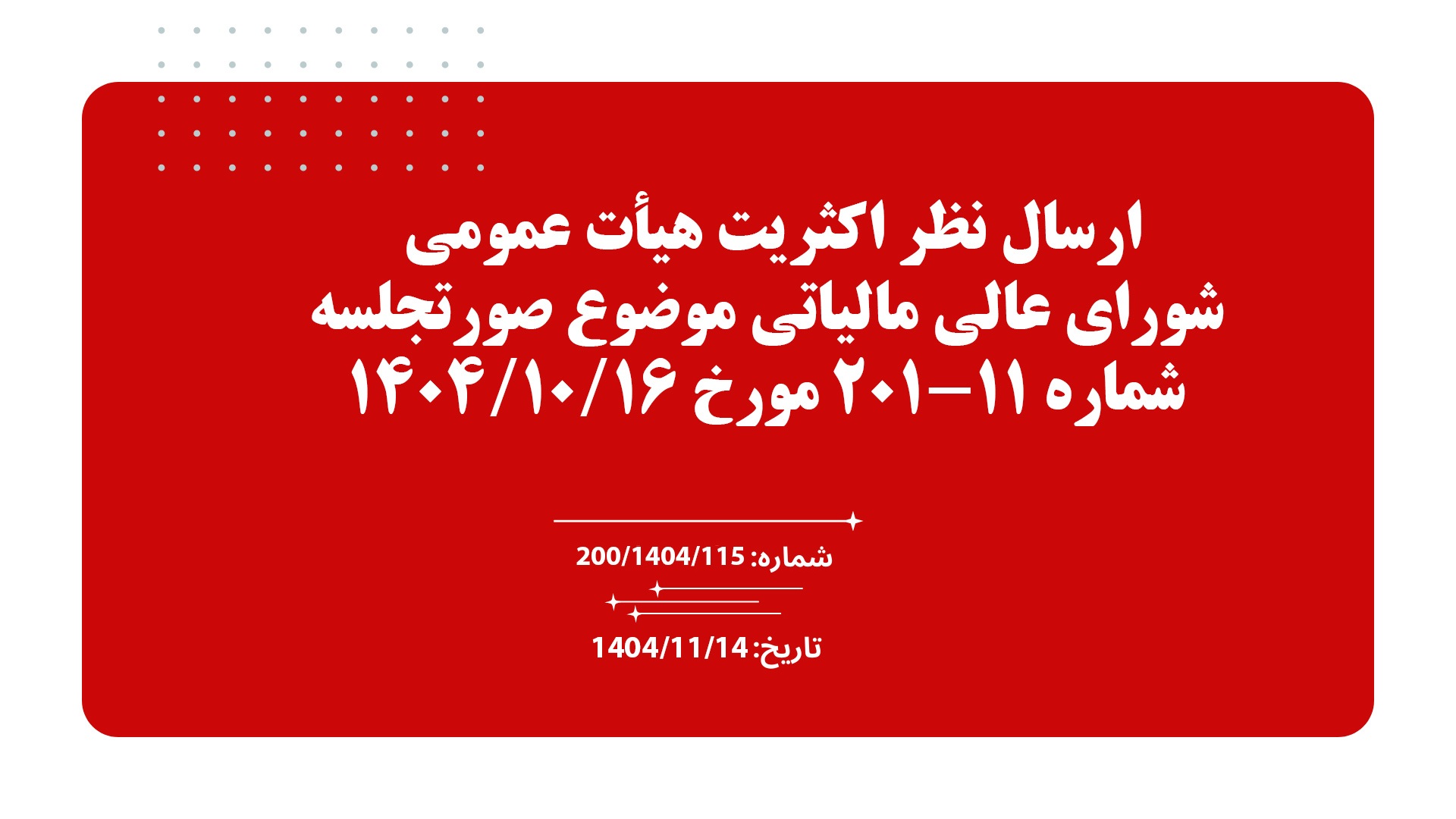 موضوع : ارسال نظراکثریت هیأت عمومی شورای عالی مالیاتی موضوع صورتجلسه شماره 11-201 مورخ 1404/10/16
