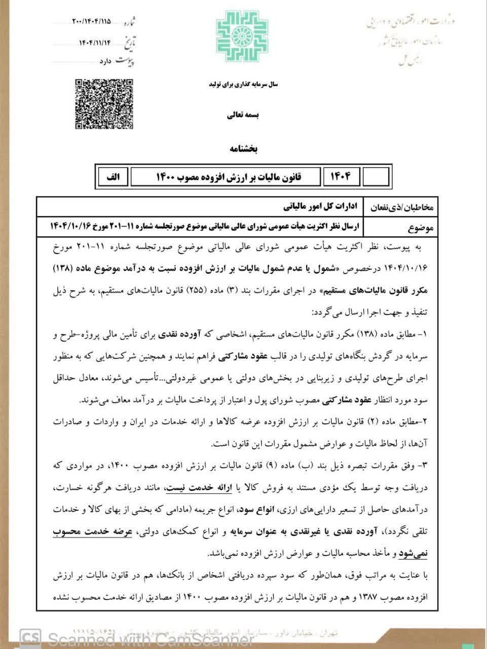 با عنایت به مراتب فوق، همان طور که سود سپرده دریافتی اشخاص از بانک ها ، هم در قانون مالیات بر ارزش افزوده مصوب 1387 و هم در قانون مالیات بر ارزش افزوده مصوب 1400 از مصادیق ارائه خدمت محسوب نشده و مشمول مالیات و عوارض ارزش افزوده نمی باشد و از طرفی نیز با امعان نظر به قسمت اول نظر اکثریت هیأت عمومی شورای عالی مالیاتی ( موضوع صورتجلسه شماره 6-201 مورخ 1404/06/29 که طی بخشنامه شماره 200/1404/85 مورخ 1404/08/10 ابلاغ شده است ) ، سود دریافتی اشخاص بابت آورده نقدی در اجرای مقررات ماده (138) مکرر قانون مالیات های مستقیم نیز به عنوان سود حاصل از سرمایه گذاری در قالب عقود مشارکتی از مصادیق ارائه خدمت نبوده و مطابق تبصره ذیل بند (ب) ماده (9) قانون مالیات بر ارزش افزوده مصوب 1400 ، مشمول پرداخت مالیات و عوارض ارزش افزوده نخواهد بود.