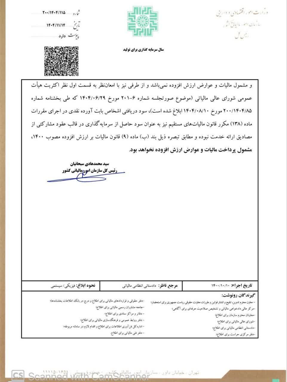 بخشنامه شماره 200/1404/115 مورخ 1404/11/14 سازمان امور مالیاتی