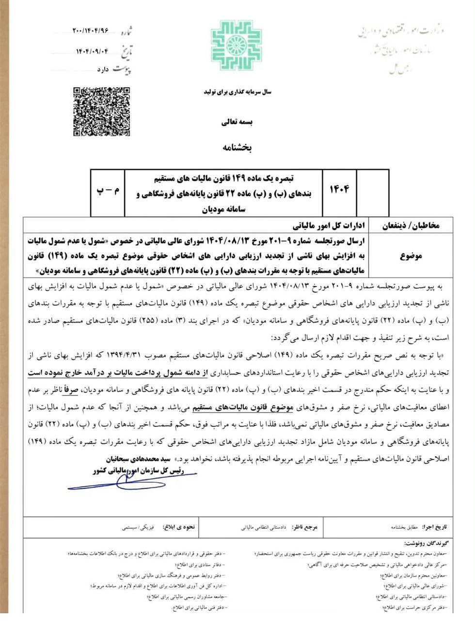 سازمان امور مالیاتی کشور طی بخشنامه ای، نظر شورای عالی مالیاتی در خصوص «شمول یا عدم شمول مالیات نسبت به افزایش بهای ناشی از تجدید ارزیابی داراییهای اشخاص حقوقی موضوع تبصره (۱) ماده (۱۴۹) قانون مالیاتهای مستقیم با توجه به مقررات بندهای (ب) و (پ) ماده (۲۲) قانون پایانههای فروشگاهی و سامانه مودیان»، در اجرای بند (۳) ماده (۲۵۵) قانون مالیاتهای مستقیم را جهت اقدام لازم ابلاغ کرد.