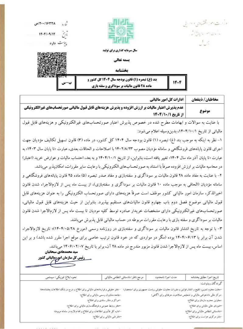 موضوع بخشنامه شماره 200/16328/ص مورخ 1404/09/12 سازمان امور مالیاتی